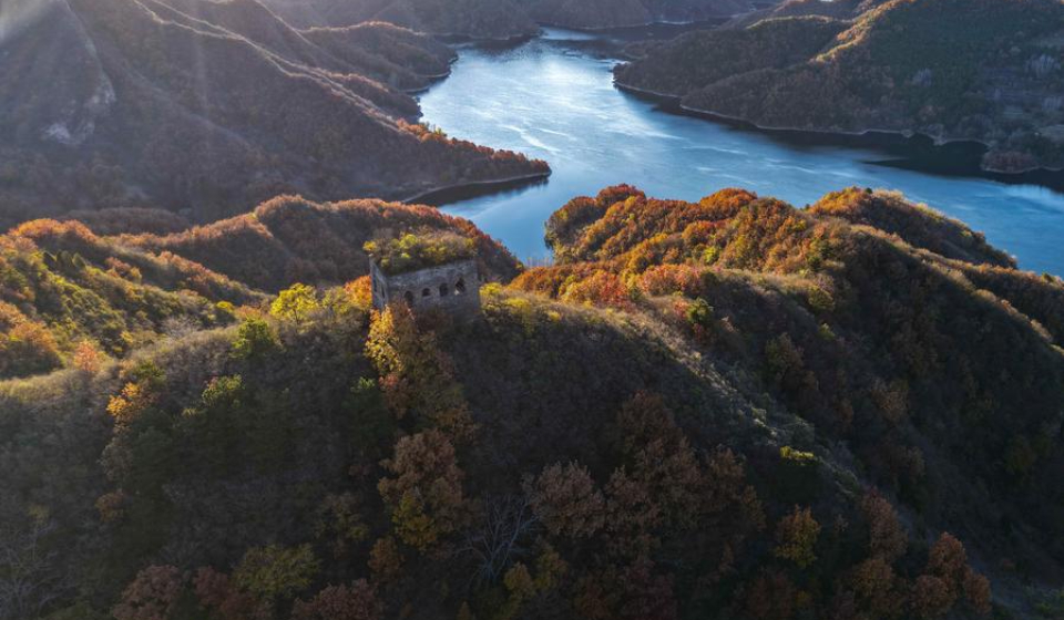 An aerial drone photo taken on Nov. 4, 2025 shows the morning view of a section of the Great Wall at Panjiakou Reservoir, Qianxi County, Tangshan City, north China's Hebei Province. (Photo by Liu Mancang/Xinhua)