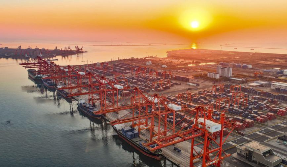 An aerial drone photo taken on Nov. 14, 2025 shows vessels moored at a container terminal in Jingtang area of Tangshan Port in Tangshan City, north China's Hebei Province. (Photo by Liu Mancang/Xinhua)