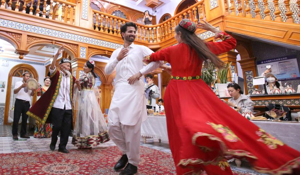 A Pakistani tourist (2nd R, front) dances with a staff member at a homestay, in the Kashgar Ancient City scenic spot, northwest China's Xinjiang Uygur Autonomous Region, Sept. 10, 2025. (Xinhua/Cheng Li)