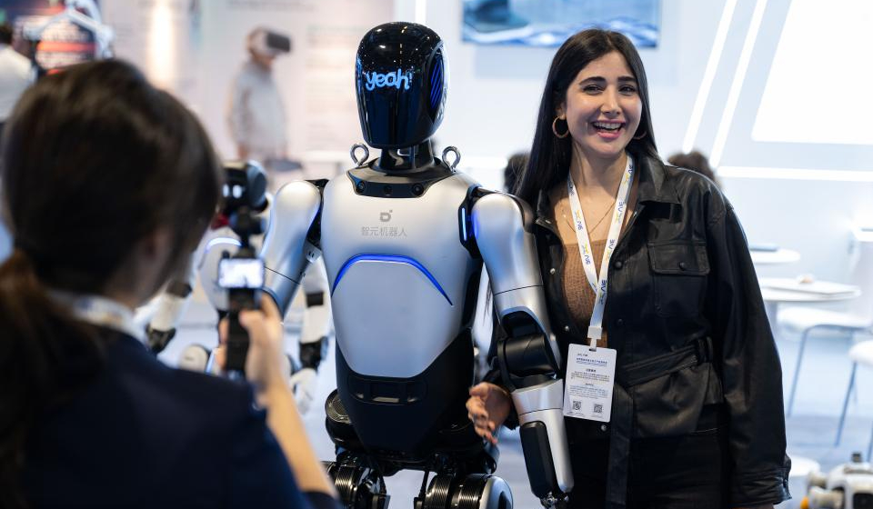 A visitor poses for pictures with a humanoid robot at the 2025 Global Artificial Intelligence Machines and Electronics Expo (AIE) in Macao, south China, Dec. 4, 2025. (Xinhua)
