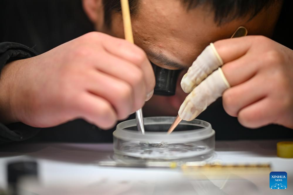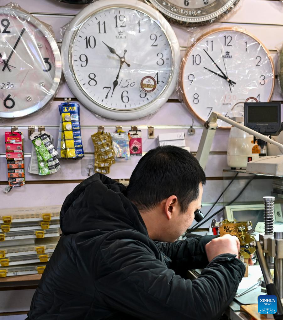 A craftsman cleans a watch part at a shop in the "repair alley" in north China's Tianjin, Dec. 9, 2025. A "repair alley" established in June 2024 has become a lively hub for neighborhood-friendly repair services in Tianjin. In this dedicated zone, local residents have easy access to daily services such as knife sharpening, darning, locksmiths and watch repair. (Xinhua/Zhang Cheng)
