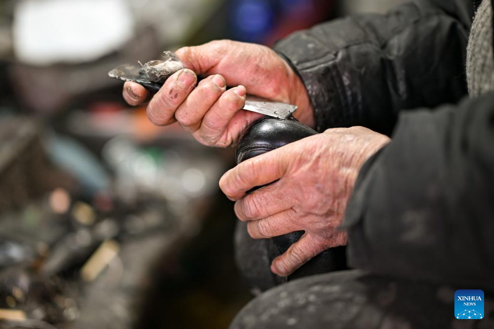 A cobbler repairs a shoe at a shop in the "repair alley" in north China's Tianjin, Dec. 9, 2025. A "repair alley" established in June 2024 has become a lively hub for neighborhood-friendly repair services in Tianjin. In this dedicated zone, local residents have easy access to daily services such as knife sharpening, darning, locksmiths and watch repair. (Xinhua/Zhang Cheng)