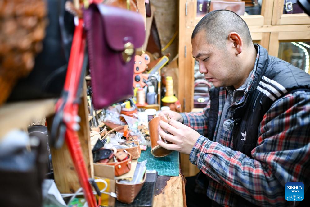 A shopkeeper crafts leather goods at a shop in the "repair alley" in north China's Tianjin, Dec. 9, 2025. A "repair alley" established in June 2024 has become a lively hub for neighborhood-friendly repair services in Tianjin. In this dedicated zone, local residents have easy access to daily services such as knife sharpening, darning, locksmiths and watch repair. (Xinhua/Zhang Cheng)
