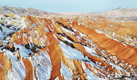 Photo taken on Dec. 21, 2025 shows scenery of the Zhangye Danxia landform in northwest China's Gansu Province after a snowfall. The snow-dusted peaks enhance the vibrant colors of the rock formations, creating a breathtaking and magical winter landscape. (Cheng Lin/Guangming Picture)