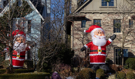 Giant-sized inflatable Santa Clauses seen on street in Toronto, Canada