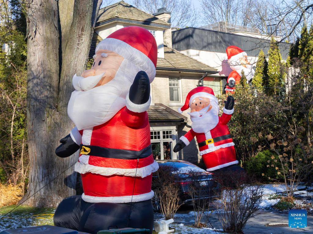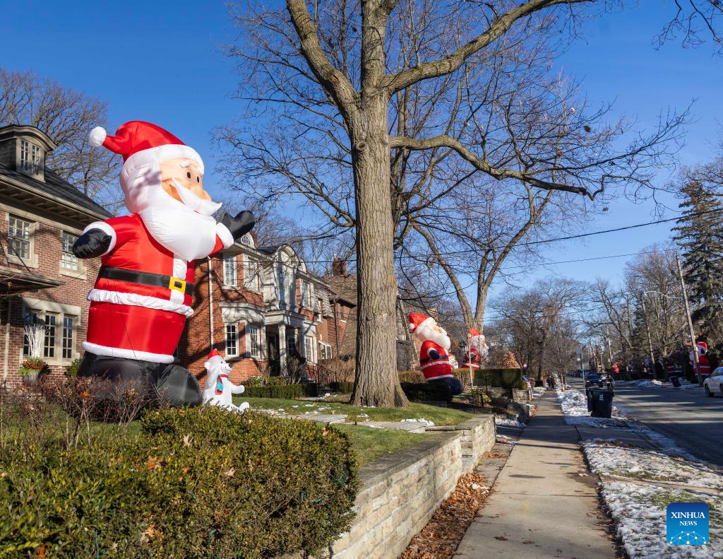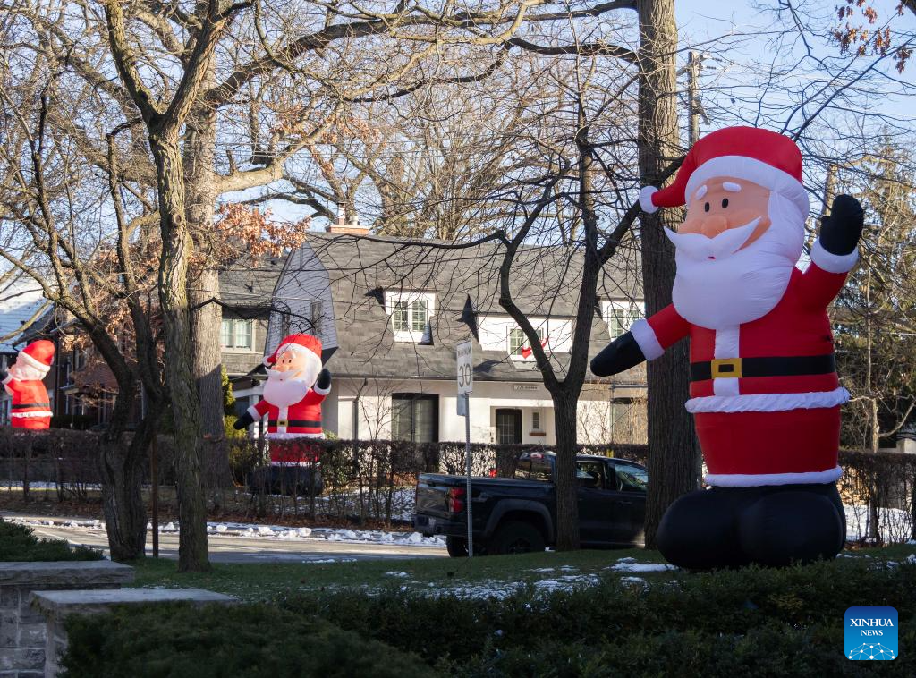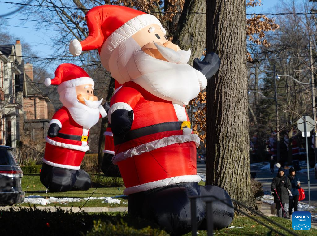 Giant-sized inflatable Santa Clauses are seen on a street in Toronto, Canada, on Dec. 24, 2025. (Photo by Zou Zheng/Xinhua)