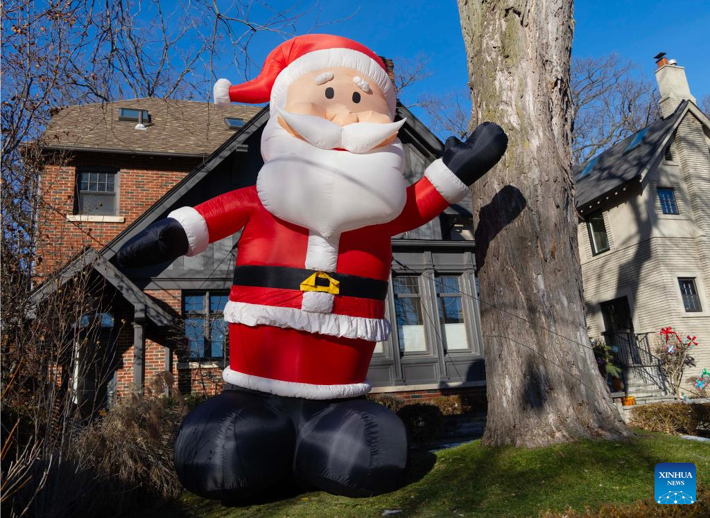 A giant-sized inflatable Santa Clause is seen on a street in Toronto, Canada, on Dec. 24, 2025. (Photo by Zou Zheng/Xinhua)