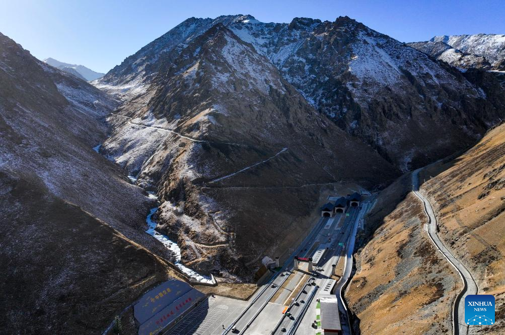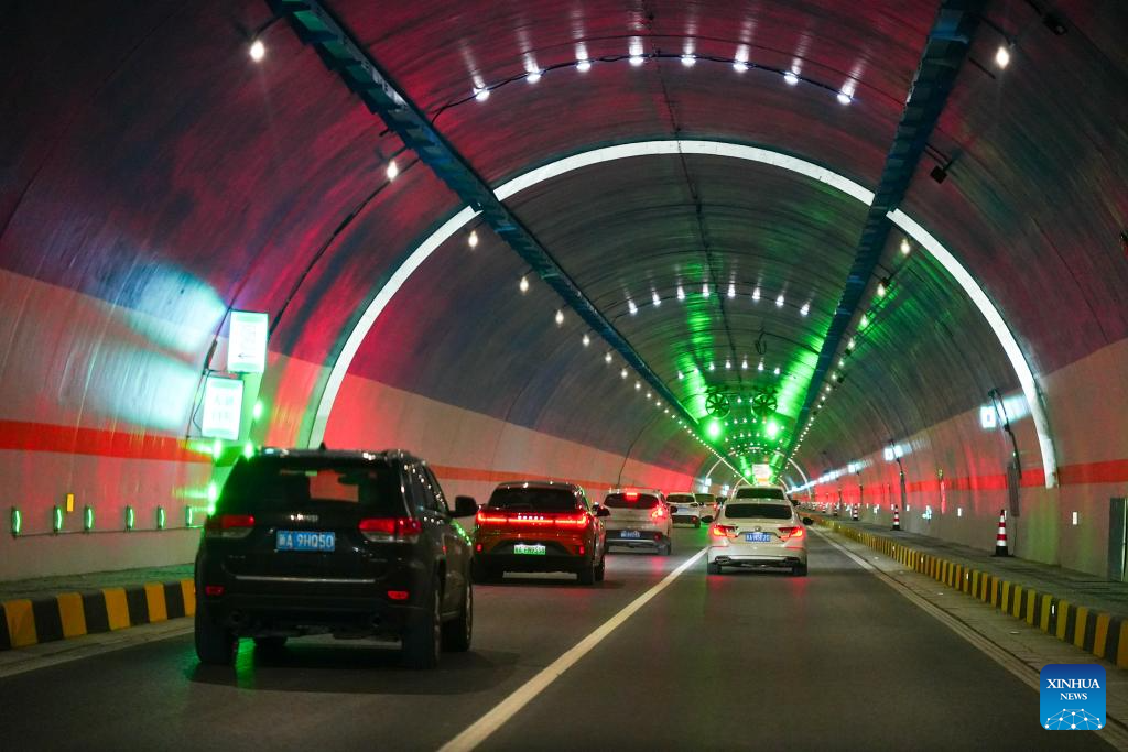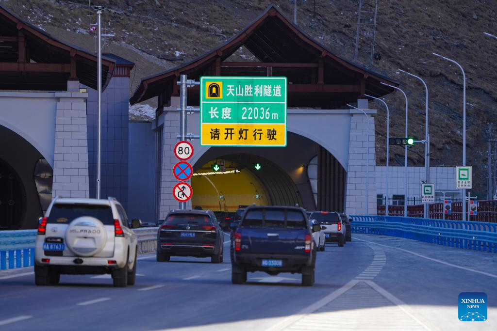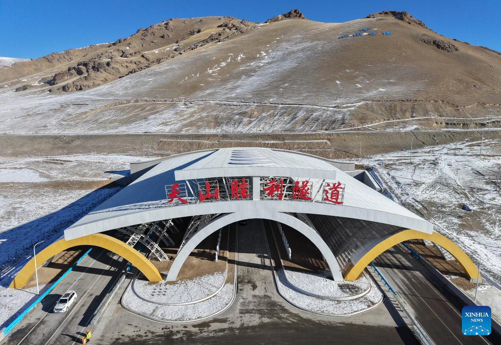 As a vital artery linking city clusters in northern and southern Xinjiang, the G0711 Urumqi-Yuli Expressway, including the tunnel, entered operation on the same day. (Xinhua/Hu Huhu)