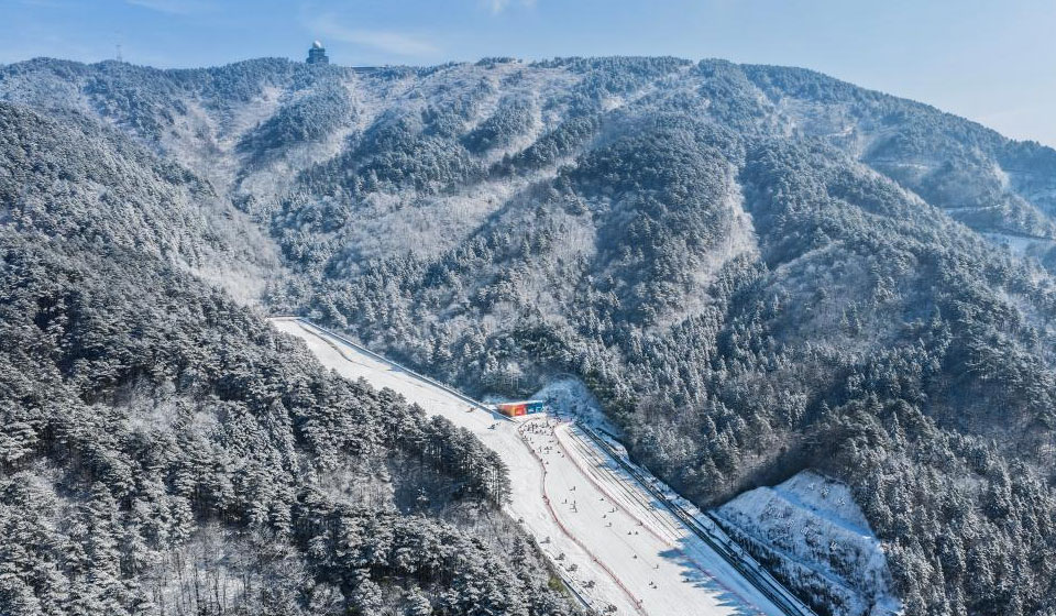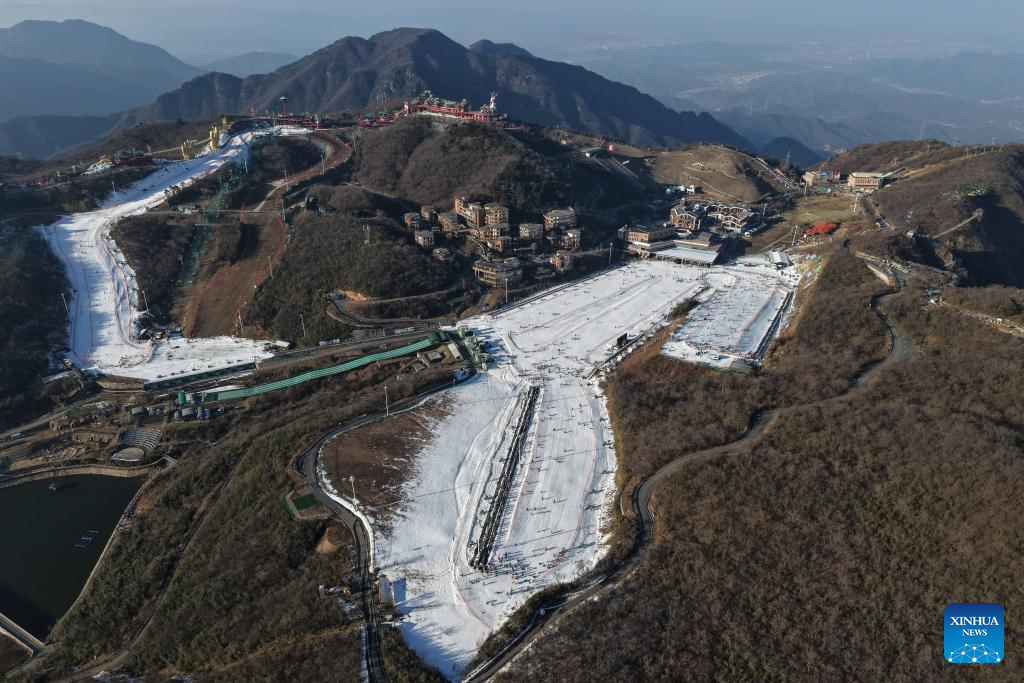 An aerial drone photo taken on Dec. 28, 2025 shows a view of the SkyLand ski resort in Anji County of Huzhou City, east China's Zhejiang Province. Skiing and a variety of other winter sports have become a popular seasonal pastime for a growing number of people in Zhejiang Province. The province boasts many ice and snow resorts, both indoor and outdoor, providing ample choices for enthusiasts. Notable examples include the Wansongling Ski Resort in Hangzhou, Qiaobo Ice and Snow World in Shaoxing, Taihu Lake Longemont Paradise in Huzhou, SkyLand ski resort in Anji, and Pan'an ski Resort in Jinhua. Moreover, such facilities are increasingly taking root across the province.