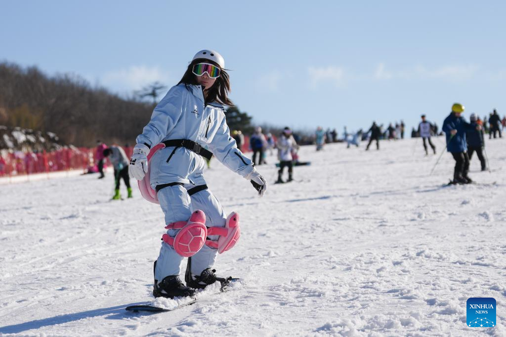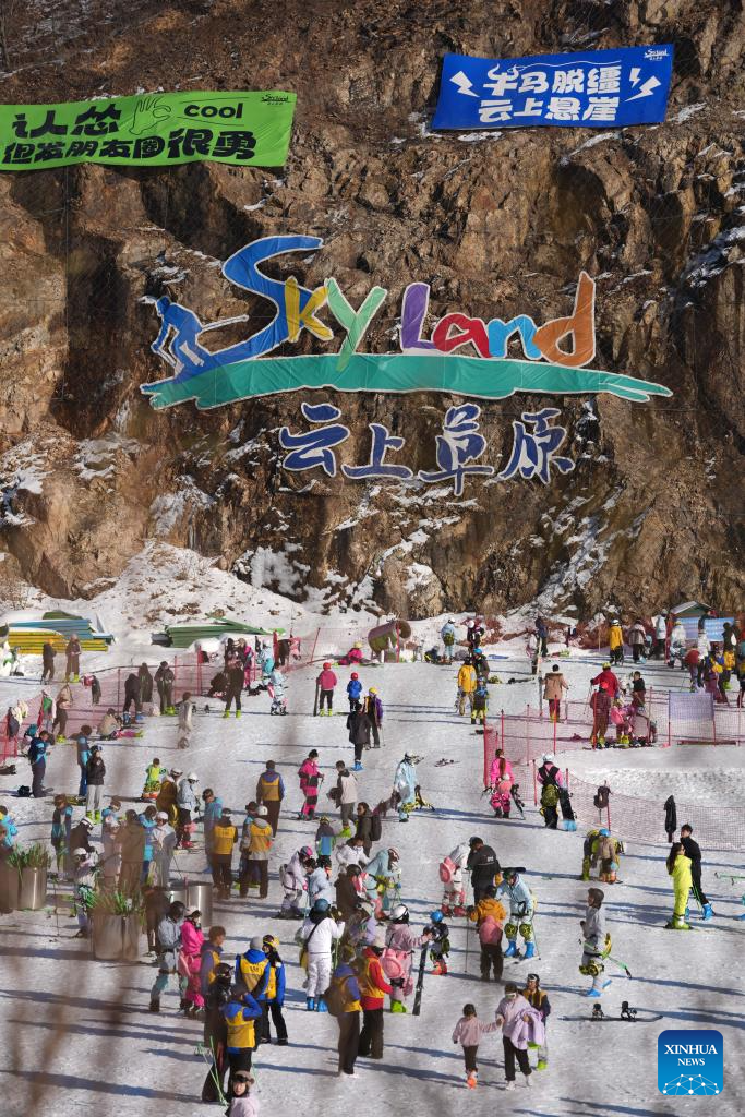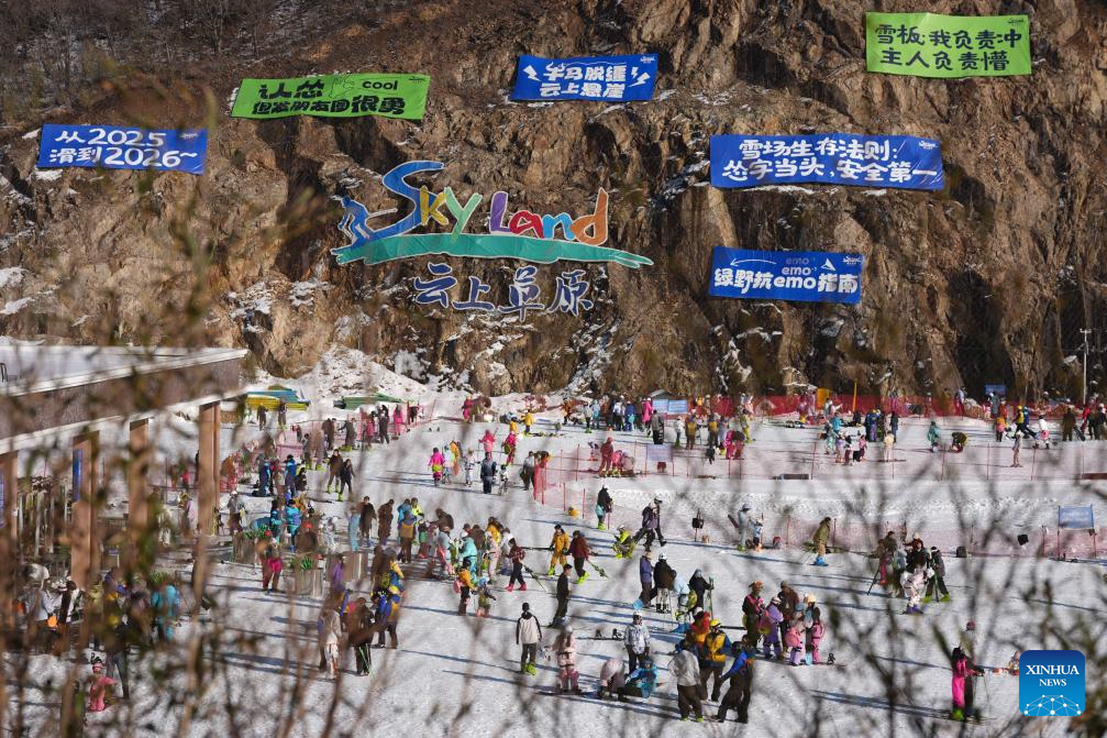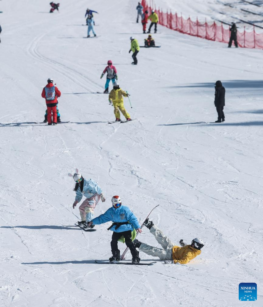 Tourists have fun at the SkyLand ski resort in Anji County of Huzhou City, east China's Zhejiang Province on Dec. 28, 2025. Skiing and a variety of other winter sports have become a popular seasonal pastime for a growing number of people in Zhejiang Province. The province boasts many ice and snow resorts, both indoor and outdoor, providing ample choices for enthusiasts. Notable examples include the Wansongling Ski Resort in Hangzhou, Qiaobo Ice and Snow World in Shaoxing, Taihu Lake Longemont Paradise in Huzhou, SkyLand ski resort in Anji, and Pan'an ski Resort in Jinhua. Moreover, such facilities are increasingly taking root across the province.