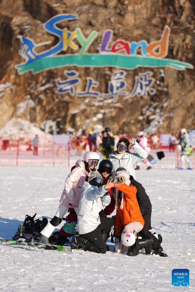Tourists pose for a selfie during a break from skiing at the SkyLand ski resort in Anji County of Huzhou City, east China's Zhejiang Province on Dec. 28, 2025. Skiing and a variety of other winter sports have become a popular seasonal pastime for a growing number of people in Zhejiang Province. The province boasts many ice and snow resorts, both indoor and outdoor, providing ample choices for enthusiasts. Notable examples include the Wansongling Ski Resort in Hangzhou, Qiaobo Ice and Snow World in Shaoxing, Taihu Lake Longemont Paradise in Huzhou, SkyLand ski resort in Anji, and Pan'an ski Resort in Jinhua. Moreover, such facilities are increasingly taking root across the province.