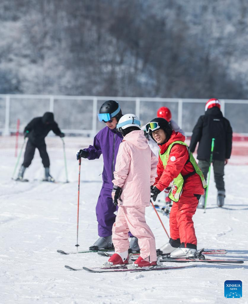 A coach guides tourists on skiing at the Wansongling Ski Resort in Hangzhou City, east China's Zhejiang Province on Dec. 25, 2025. Skiing and a variety of other winter sports have become a popular seasonal pastime for a growing number of people in Zhejiang Province. The province boasts many ice and snow resorts, both indoor and outdoor, providing ample choices for enthusiasts. Notable examples include the Wansongling Ski Resort in Hangzhou, Qiaobo Ice and Snow World in Shaoxing, Taihu Lake Longemont Paradise in Huzhou, SkyLand ski resort in Anji, and Pan'an ski Resort in Jinhua. Moreover, such facilities are increasingly taking root across the province.