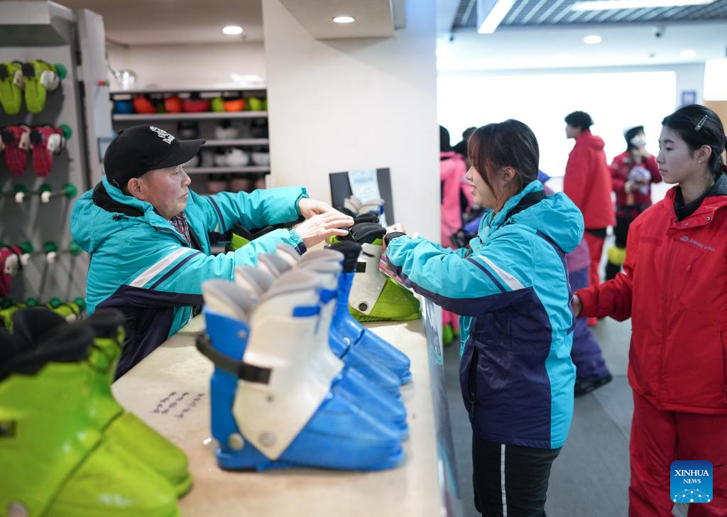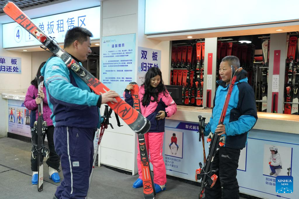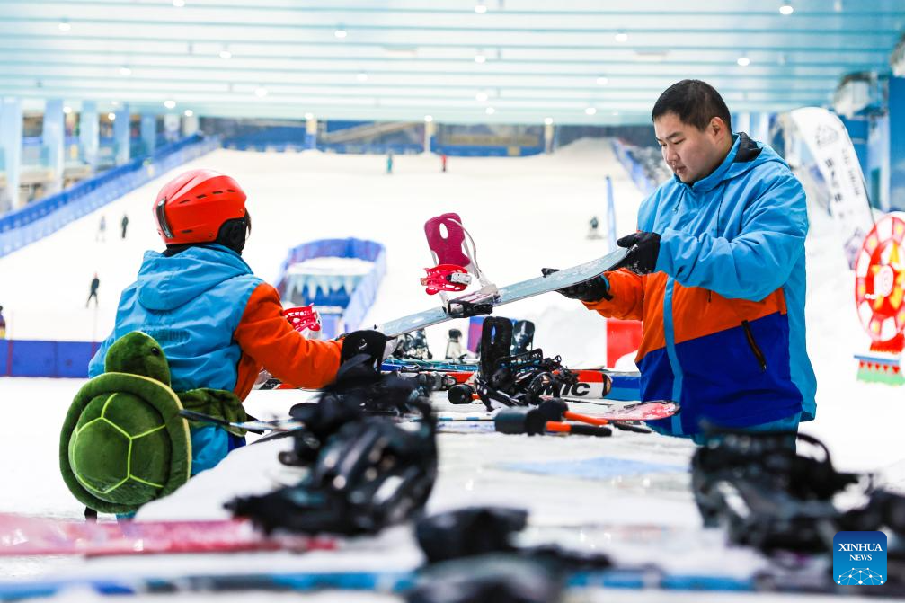Tourists rent ski equipment and get prepared at the Qiaobo Ice and Snow World in Shaoxing City, east China's Zhejiang Province, Dec. 24, 2025. Skiing and a variety of other winter sports have become a popular seasonal pastime for a growing number of people in Zhejiang Province. The province boasts many ice and snow resorts, both indoor and outdoor, providing ample choices for enthusiasts. Notable examples include the Wansongling Ski Resort in Hangzhou, Qiaobo Ice and Snow World in Shaoxing, Taihu Lake Longemont Paradise in Huzhou, SkyLand ski resort in Anji, and Pan'an ski Resort in Jinhua. Moreover, such facilities are increasingly taking root across the province.