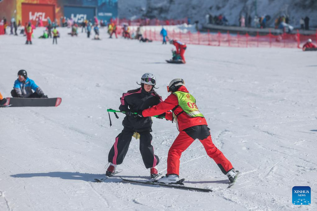 A coach guides a tourist on skiing at the Wansongling Ski Resort in Hangzhou City, east China's Zhejiang Province on Dec. 25, 2025. Skiing and a variety of other winter sports have become a popular seasonal pastime for a growing number of people in Zhejiang Province. The province boasts many ice and snow resorts, both indoor and outdoor, providing ample choices for enthusiasts. Notable examples include the Wansongling Ski Resort in Hangzhou, Qiaobo Ice and Snow World in Shaoxing, Taihu Lake Longemont Paradise in Huzhou, SkyLand ski resort in Anji, and Pan'an ski Resort in Jinhua. Moreover, such facilities are increasingly taking root across the province.