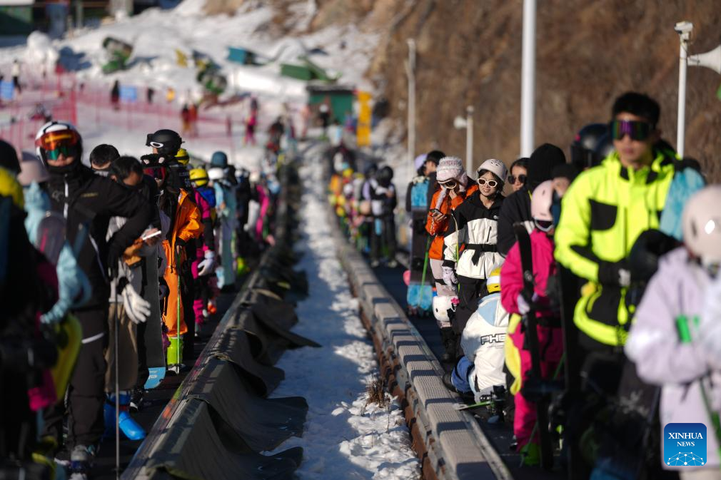 People are pictured on the conveyor belts at the SkyLand ski resort in Anji County of Huzhou City, east China's Zhejiang Province on Dec. 28, 2025. Skiing and a variety of other winter sports have become a popular seasonal pastime for a growing number of people in Zhejiang Province. The province boasts many ice and snow resorts, both indoor and outdoor, providing ample choices for enthusiasts. Notable examples include the Wansongling Ski Resort in Hangzhou, Qiaobo Ice and Snow World in Shaoxing, Taihu Lake Longemont Paradise in Huzhou, SkyLand ski resort in Anji, and Pan'an ski Resort in Jinhua. Moreover, such facilities are increasingly taking root across the province.