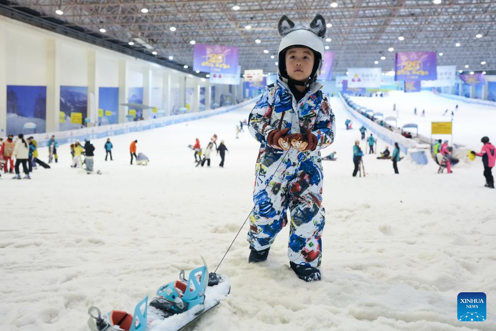A child plays at the Qiaobo Ice and Snow World in Shaoxing City, east China's Zhejiang Province, Dec. 24, 2025. Skiing and a variety of other winter sports have become a popular seasonal pastime for a growing number of people in Zhejiang Province. The province boasts many ice and snow resorts, both indoor and outdoor, providing ample choices for enthusiasts. Notable examples include the Wansongling Ski Resort in Hangzhou, Qiaobo Ice and Snow World in Shaoxing, Taihu Lake Longemont Paradise in Huzhou, SkyLand ski resort in Anji, and Pan'an ski Resort in Jinhua. Moreover, such facilities are increasingly taking root across the province.