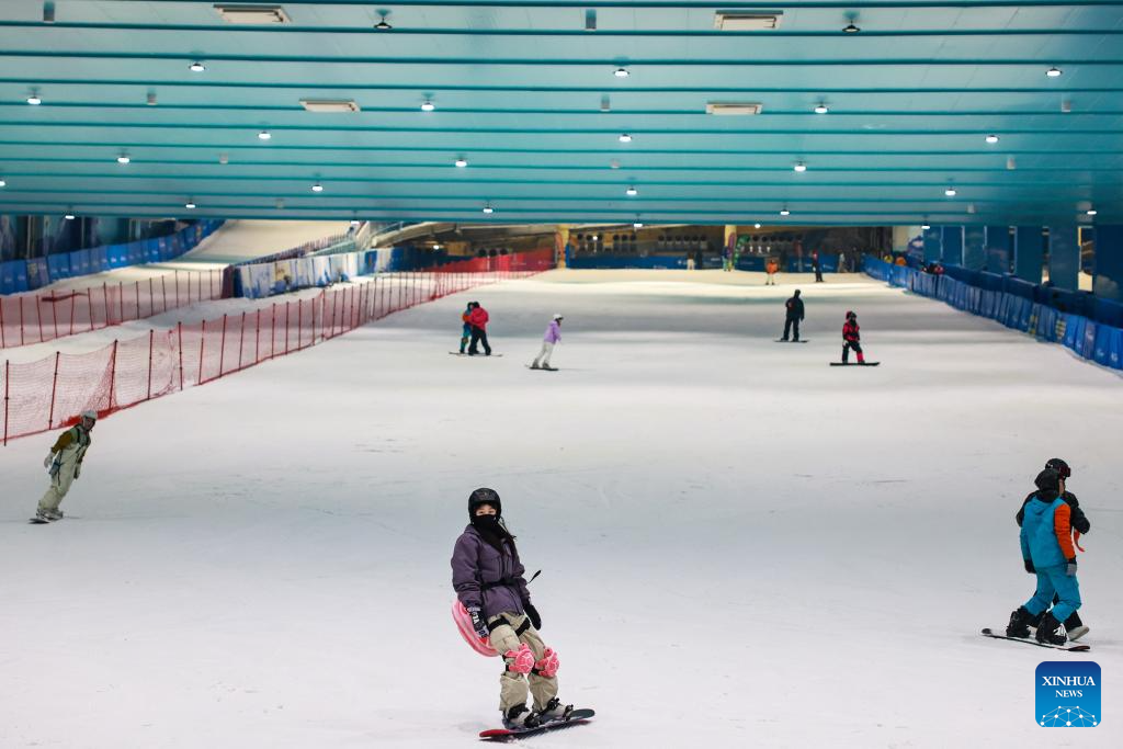 Tourists ski at the Ice and Snow world of the Taihu Lake Longemont Paradise in Changxing County of Huzhou City, east China's Zhejiang Province, Dec. 29, 2025. Skiing and a variety of other winter sports have become a popular seasonal pastime for a growing number of people in Zhejiang Province. The province boasts many ice and snow resorts, both indoor and outdoor, providing ample choices for enthusiasts. Notable examples include the Wansongling Ski Resort in Hangzhou, Qiaobo Ice and Snow World in Shaoxing, Taihu Lake Longemont Paradise in Huzhou, SkyLand ski resort in Anji, and Pan'an ski Resort in Jinhua. Moreover, such facilities are increasingly taking root across the province.