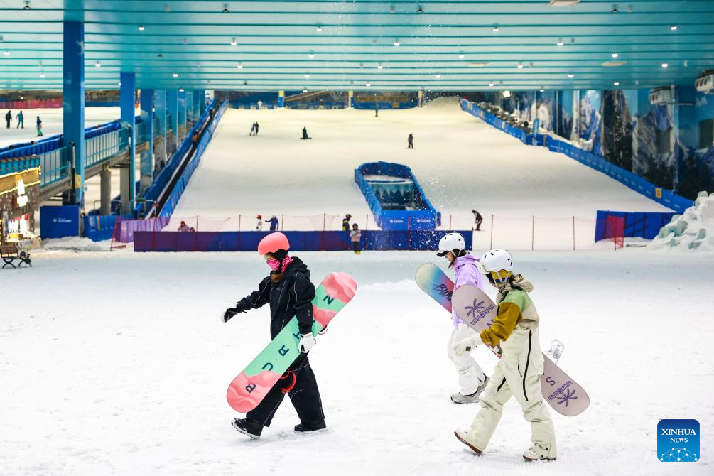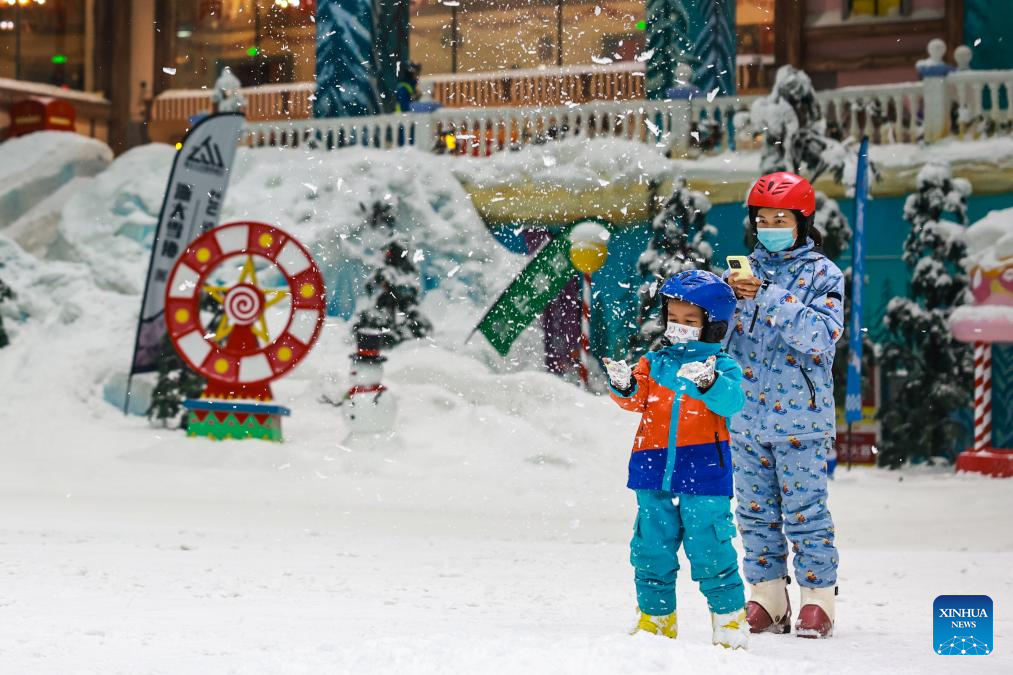Tourists walk at the ice and snow world of the Taihu Lake Longemont Paradise in Changxing County of Huzhou City, east China's Zhejiang Province, Dec. 29, 2025. Skiing and a variety of other winter sports have become a popular seasonal pastime for a growing number of people in Zhejiang Province. The province boasts many ice and snow resorts, both indoor and outdoor, providing ample choices for enthusiasts. Notable examples include the Wansongling Ski Resort in Hangzhou, Qiaobo Ice and Snow World in Shaoxing, Taihu Lake Longemont Paradise in Huzhou, SkyLand ski resort in Anji, and Pan'an ski Resort in Jinhua. Moreover, such facilities are increasingly taking root across the province.