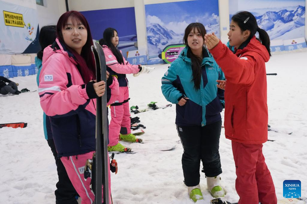 A coach (1st R) introduces the ski resort to ski beginners at the Qiaobo Ice and Snow World in Shaoxing City, east China's Zhejiang Province, Dec. 24, 2025. Skiing and a variety of other winter sports have become a popular seasonal pastime for a growing number of people in Zhejiang Province. The province boasts many ice and snow resorts, both indoor and outdoor, providing ample choices for enthusiasts. Notable examples include the Wansongling Ski Resort in Hangzhou, Qiaobo Ice and Snow World in Shaoxing, Taihu Lake Longemont Paradise in Huzhou, SkyLand ski resort in Anji, and Pan'an ski Resort in Jinhua. Moreover, such facilities are increasingly taking root across the province.