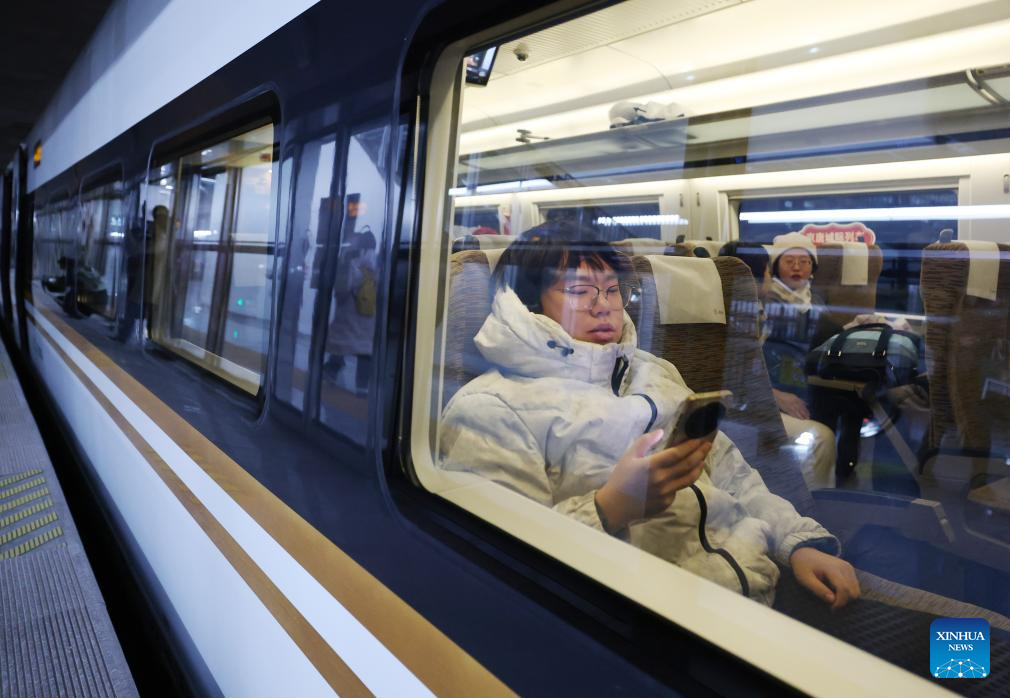 Passengers wait for departure on a train bound for Tangshan in north China's Hebei Province, at Beijing Tongzhou Railway Station in Beijing, capital of China, Dec. 30, 2025.
