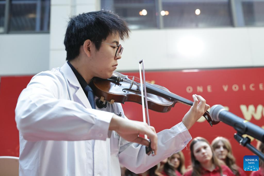 Ouyang Quanshi from the Peking Union Medical College Hospital (PUMCH) plays the violin during a performance at the PUMCH in Beijing, capital of China, Dec. 31, 2025. Fifty-six young performers from One Voice Children's Choir along with invited musicians gave a performance at the hospital on Wednesday. (Xinhua/Zhang Yuwei)