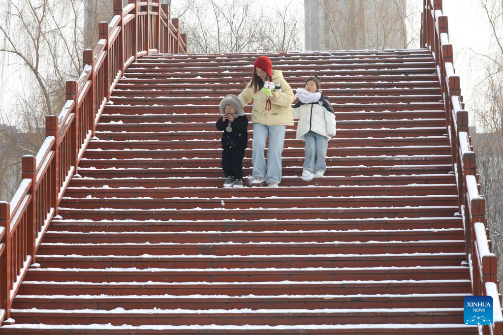 Citizens visit a park after a snowfall in Jiaozuo City, central China's Henan Province, Jan. 1, 2026. Snowfall hit many parts of China during the New Year's Day holiday, drawing tourists to enjoy the snowy scenery. (Photo by Xu Hongxing/Xinhua)