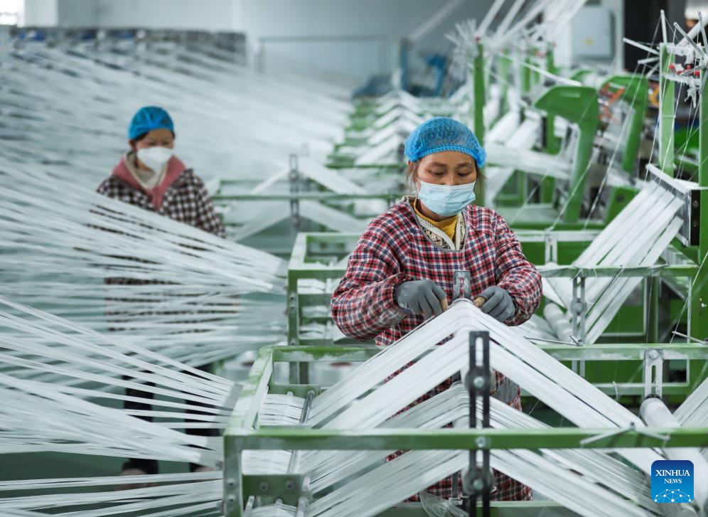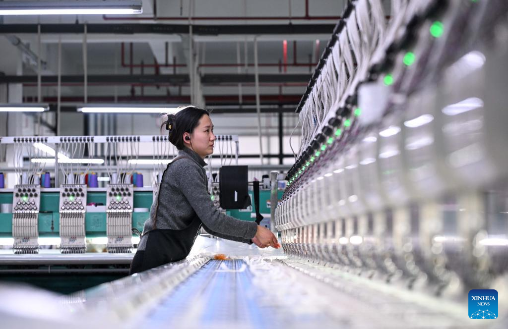 A worker operates on a textile production line of a company in Shizhong District of Zaozhuang, east China's Shandong Province, Jan. 4, 2026. (Photo by Sun Zhongzhe/Xinhua)