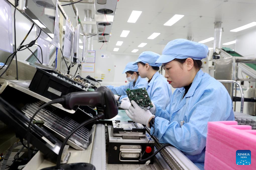 Workers operate on a production line of automotive intelligent central control navigation products at the workshop of a company in Suqian New &Hi-tech Industry Development Zone of Suqian City, east China's Jiangsu Province, Jan. 4, 2026. (Photo by Wang Li/Xinhua)