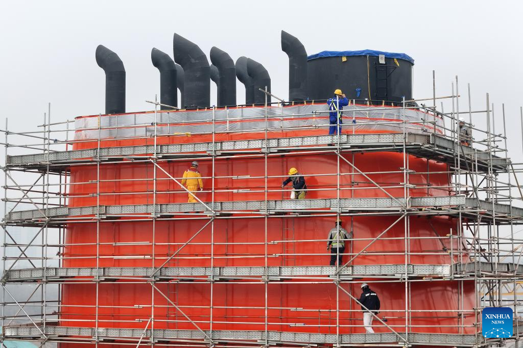 A drone photo taken on Jan. 4, 2026 shows staff members checking the quality of a part of a ship at a shipyard in Yantai, east China's Shandong Province. (Photo by Tang Ke/Xinhua)