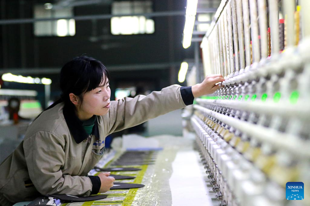 A worker operates on a production line at the embroidery workshop of a hat company in Xiayi County of Shangqiu, central China's Henan Province, Jan. 4, 2026. (Photo by Miao Yucai/Xinhua)