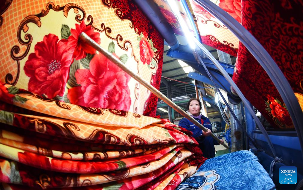 A worker operates on a blanket production line at the workshop of a company in Lianyungang, east China's Jiangsu Province, Jan. 4, 2026. (Photo by Geng Yuhe/Xinhua)