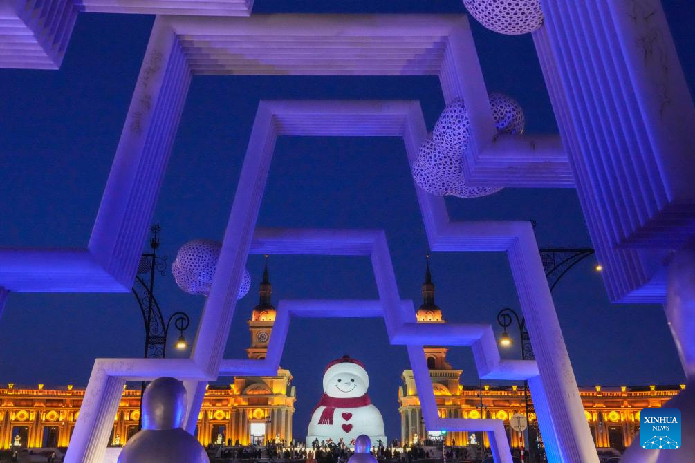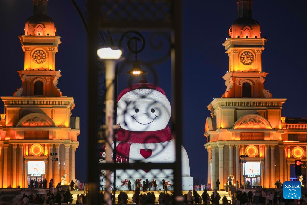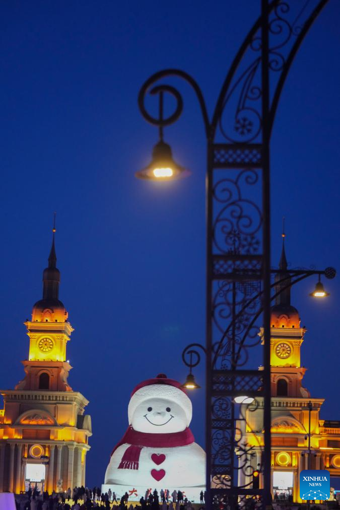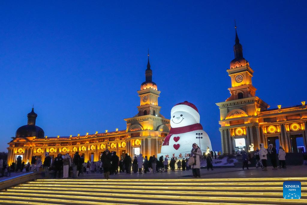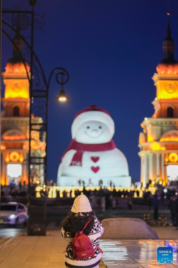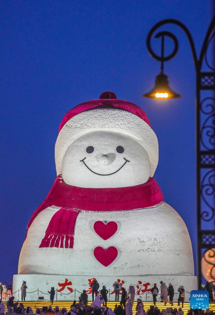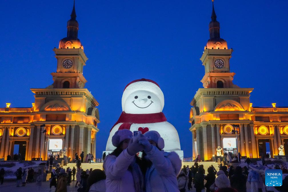 Tourists take photos of the iconic giant snowman at the Qunli music park in Harbin, northeast China's Heilongjiang Province, Jan. 10, 2026.