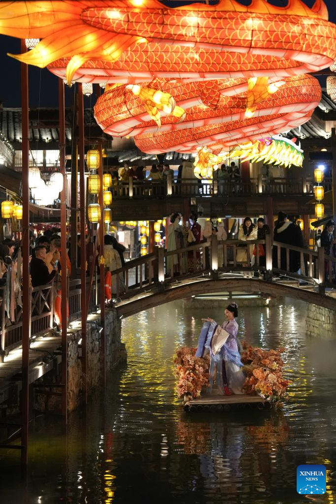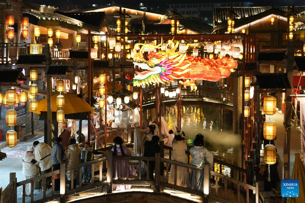 Tourists have fun at Nanyueli, a food and cultural block in Nanyue District of Hengyang, central China's Hunan Province, on Jan. 9, 2026. Integrating various business formats such as catering, accommodation, travel photography and performances, Nanyueli provides tourists with diverse traveling experiences. In recent years, the local government has been creating new scenarios and business forms to boost the night economy by leveraging the historical and cultural resources. (Xinhua/Chen Zhenhai)