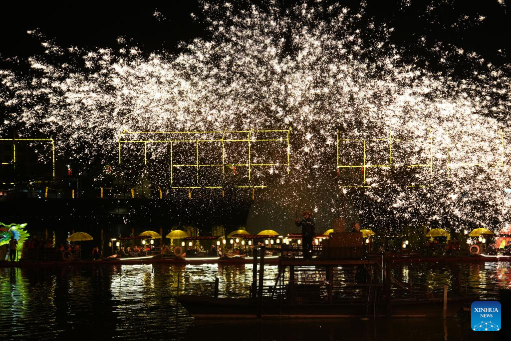 A molten iron firework show is staged at Nanyueli, a food and cultural block in Nanyue District of Hengyang, central China's Hunan Province, on Jan. 9, 2026. Integrating various business formats such as catering, accommodation, travel photography and performances, Nanyueli provides tourists with perse traveling experiences. In recent years, the local government has been creating new scenarios and business forms to boost the night economy by leveraging the historical and cultural resources. (Xinhua/Chen Zhenhai)