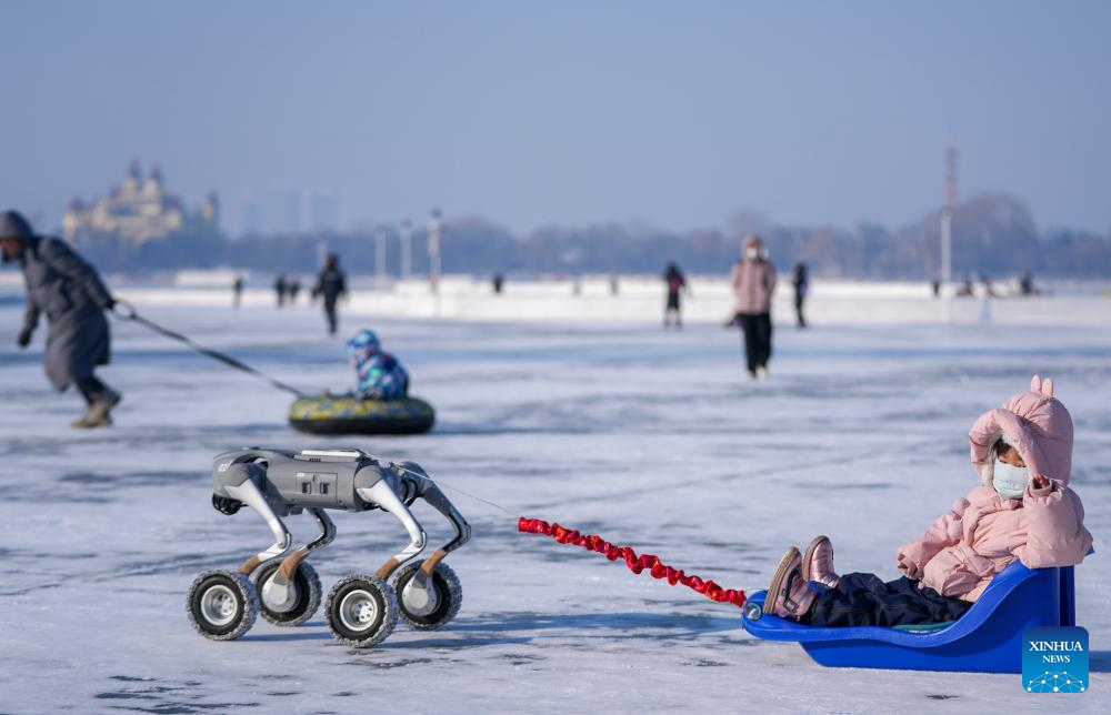 A child rides sled pulled by a robotic dog on the frozen surface of the Songhua River in Harbin, northeast China's Heilongjiang Province, Jan. 11, 2026. The surface of the Harbin section of Songhua River, now solidly frozen, serves as a "fun field," where locals and tourists alike enjoy themselves with ice-and-snow-themed amusements. (Xinhua/Wang Jianwei)