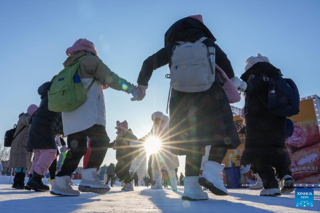 Tourists play on the frozen surface of the Songhua River in Harbin, northeast China's Heilongjiang Province, Jan. 11, 2026. The surface of the Harbin section of Songhua River, now solidly frozen, serves as a "fun field," where locals and tourists alike enjoy themselves with ice-and-snow-themed amusements. (Xinhua/Wang Jianwei)