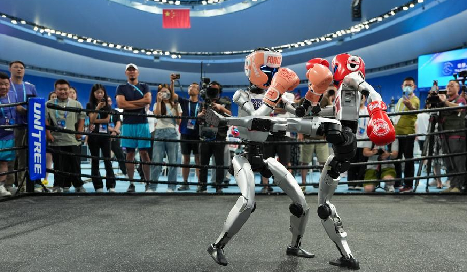 This file photo taken on Aug. 15, 2025 shows humanoid robots combating during a kickboxing match at the 2025 World Humanoid Robot Games in Beijing, capital of China. (Xinhua/Ju Huanzong)