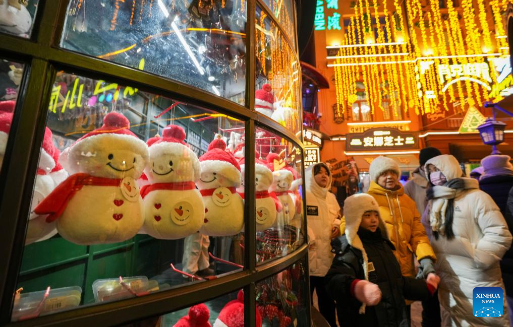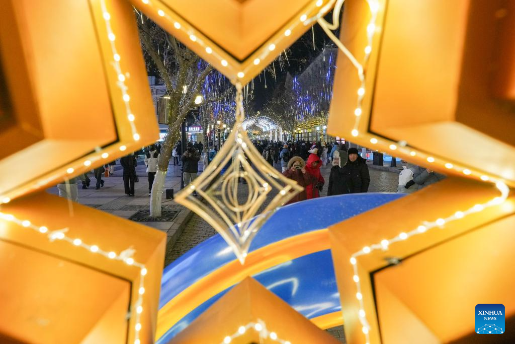 People visit the Central Street in Harbin, northeast China's Heilongjiang Province, Jan. 12, 2026. As one of the most popular attractions in Harbin, the Central Street, which is renowned for its diverse European-style architecture, wows tourists with its colorful lights at night during the city's tourism boom this winter. (Xinhua/Zhang Tao)