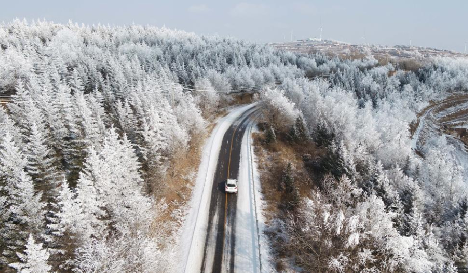An aerial drone photo taken on Jan. 5, 2026 shows rime scenery in Huajialing Town, Dingxi City of northwest China's Gansu Province.