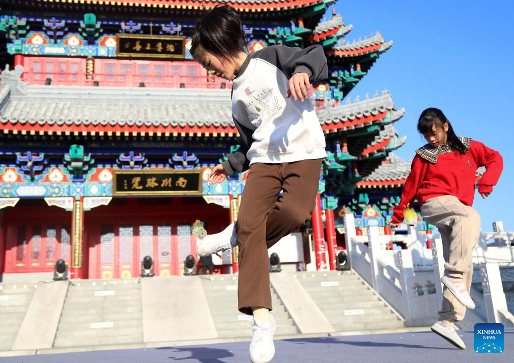This photo taken on Dec. 21, 2025 shows children playing shuttlecock during a competition on an ancient street on Winter Solstice in Cangzhou City, north China's Hebei Province.