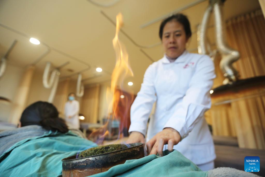 This photo taken on Jan. 8, 2026 shows a doctor giving moxibustion treatment for a patient at a traditional Chinese medicine hospital in Dingxi City, northwest China's Gansu Province.
