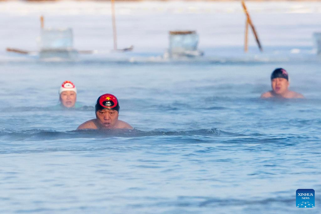 This photo taken on Jan. 13, 2026 shows winter swimming enthusiasts swimming in a river in Harbin, northeast China's Heilongjiang Province.