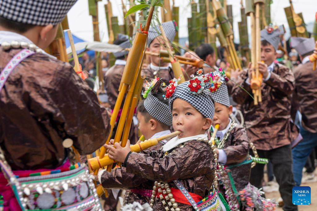 This photo taken on Dec. 21, 2025 shows children of Miao ethnic group playing Lusheng, a traditional reed-pipe wind instrument, during a Lusheng festival on Winter Solstice in Dadong Village, Congjiang County of southwest China's Guizhou Province.