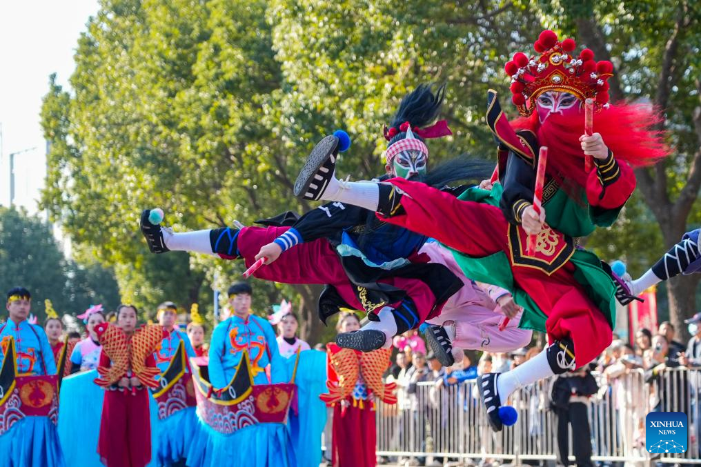 This photo taken on Dec. 20, 2025 shows folk artists performing Yingge Dance during a cultural parade in Xiepu Town, Ningbo City of east China's Zhejiang Province.