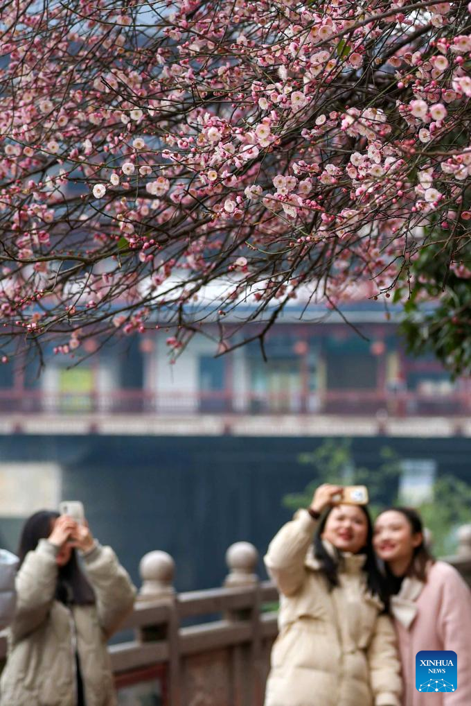 This photo taken on Jan. 5, 2026 shows people taking photos of plum flowers in Yuping Dong Autonomous County, Tongren City of southwest China's Guizhou Province.
