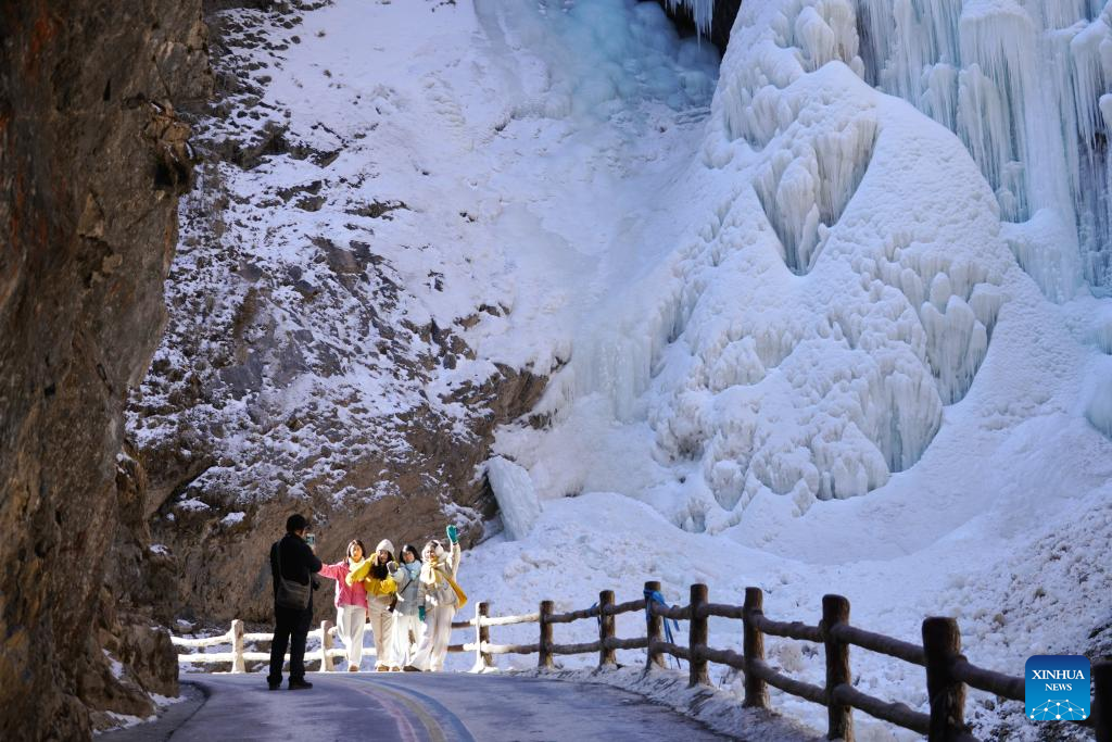 People pose for photos with ice cascade in the backdrop at Guan'egou scenic spot in Dangchang County, northwest China's Gansu Province, Jan. 9, 2026.