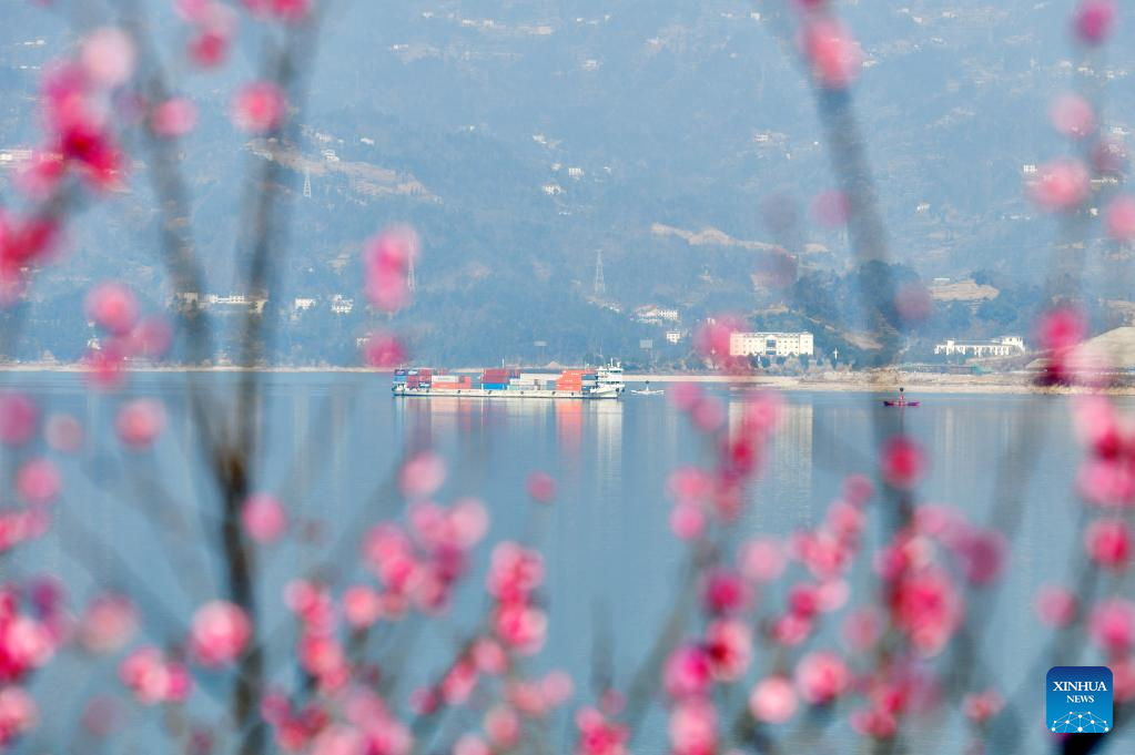 This photo taken on Jan. 11, 2026 shows plum flowers seen on a bank of Taiping creek in Yichang City, central China's Hubei Province.