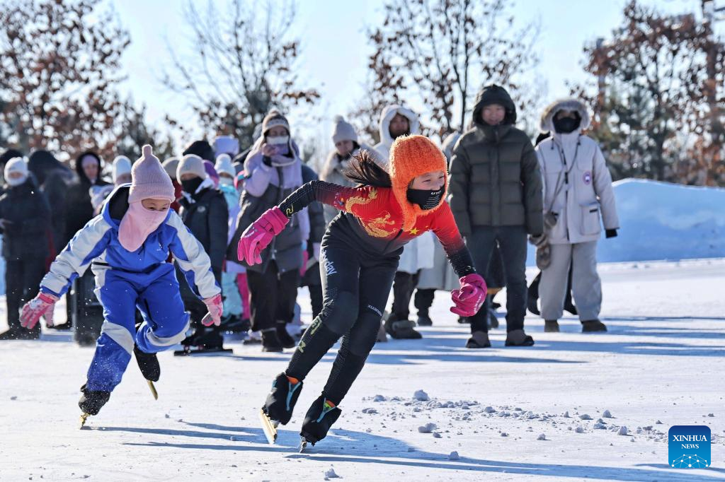 This photo taken on Jan. 12, 2026 shows students exercising for short track speed skating in Tongjiang City, northeast China's Heilongjiang Province.