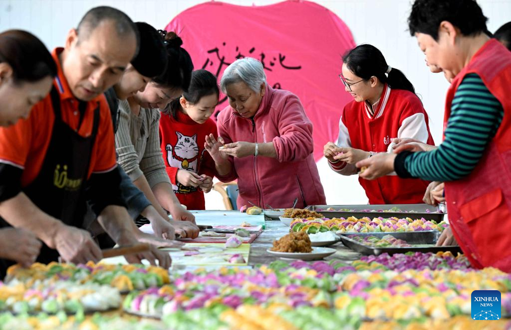 This photo taken on Dec. 21, 2025 shows community volunteers and elders making dumplings at an elder apartment on Winter Solstice in Shijiazhuang City, north China's Hebei Province.