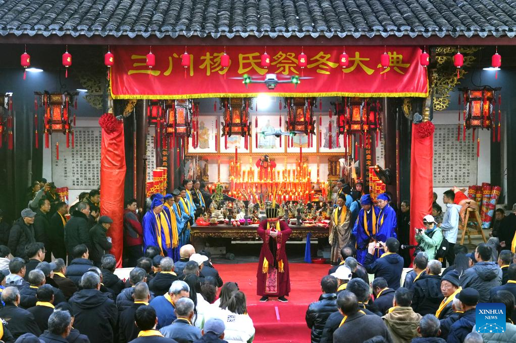 This photo taken on Dec. 21, 2025 shows a tradtional winter worship ceremy held on Winter Solstice in Yangjia Village, Taizhou City of east China's Zhejiang Province.